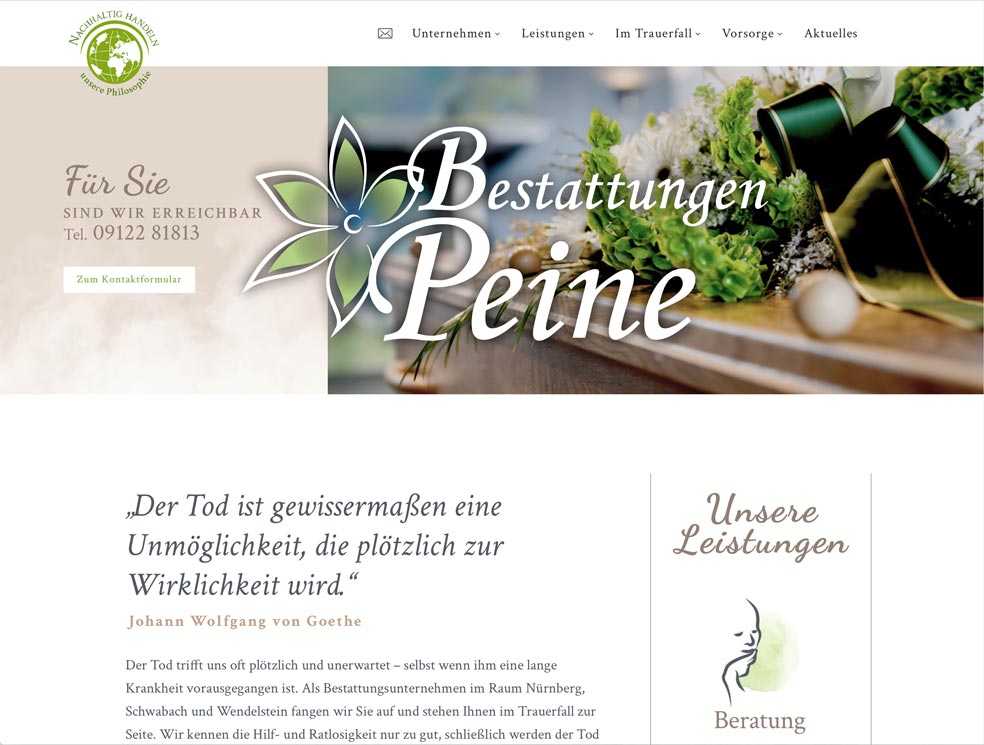 Das Bestattungsinstitut Peine in Nürnberg hat einen Generationenwechsel hinter sich. Somit stand eine Neugestaltung des gesamten Unternehmensauftrittes an: angefangen mit einem Corporate Design, über die Logo- und Webseitengestaltung bis hin zu Visitenkarten und Geschäftspapier. Das Gesamtkonzept, die Bildsprache, das Design und die Texte sollten Neubeginn und Tradition miteinander in Einklang bringen, menschliche Nähe und Professionalität ausstrahlen. Im Zusammenhang mit der Geschäftsübergabe ist auch ein Beitrag für die Lokalpresse sowie für das Fachmagazin "bestattungskultur" aus unserer Feder erschienen.